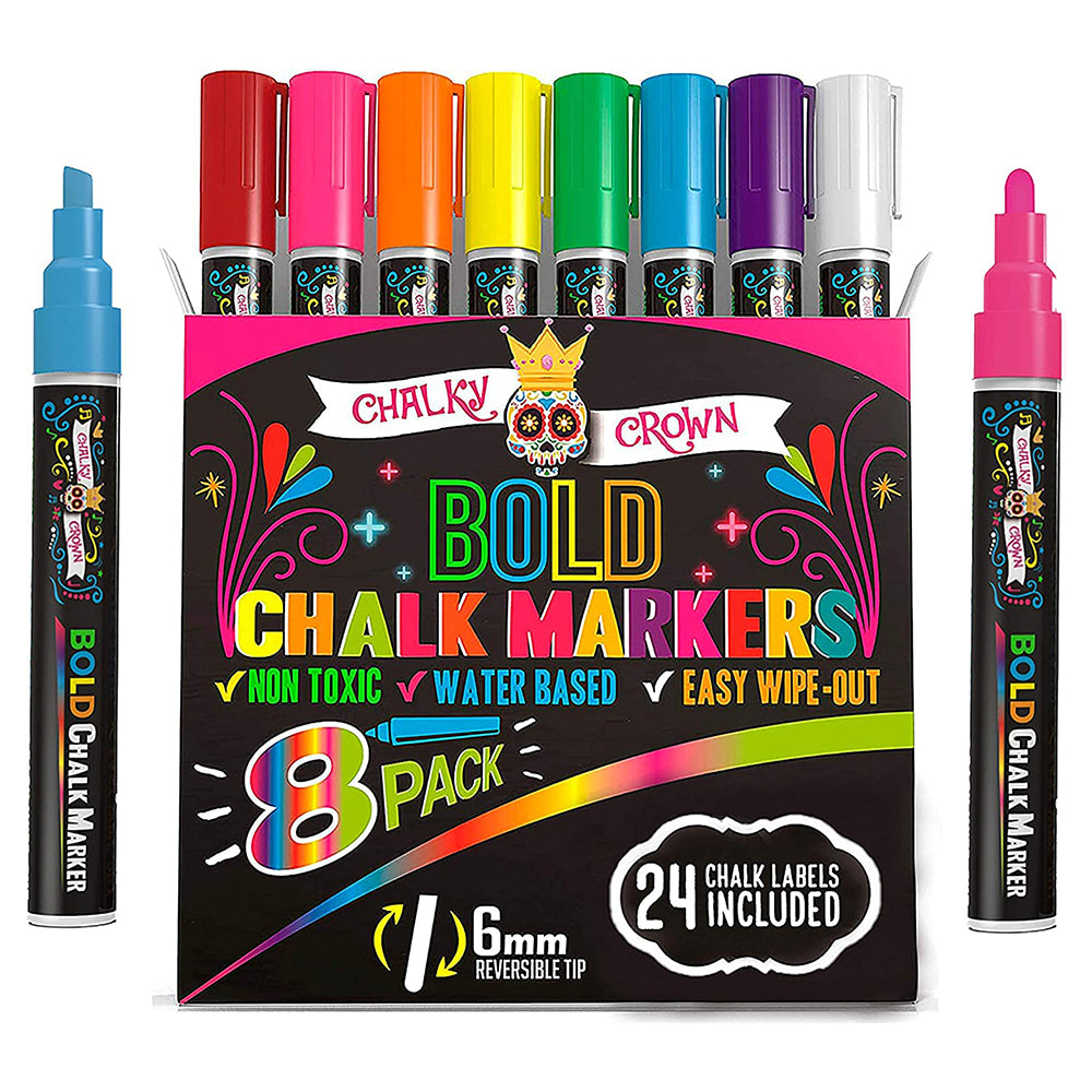 These Bold Chalk Markers are water-based and have a reversible tip. So they are washable, reusable and safe to use while keeping their incredible vibrant colors.